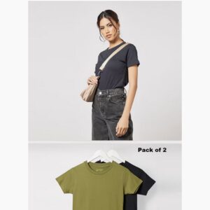 بسته 2 عددی تیشرت زنانه پنبهای ساده رنگ مشکی/زیتونی Pack Of 2 Women’s Basic Crew Neck Cotton Biowashed
