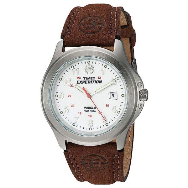 ساعت مچی مردانه Timex Men’s Expedition Metal Field Watch با بند چرمی قهوه‌ای با سایز کامل ظاهری شبیه به یک ساعت معمولی دارد. عقربه های چوبی نورانی (با عقربه ثانیه) و نمایشگر تاریخ در ساعت 3. با عملکرد تاریخ سریع، می توانید تاریخ را بدون چرخاندن تاج برای هر 24 ساعت بر روی ساعت تنظیم کنید. فقط ساقه را تا نیمه بیرون بکشید و تا رسیدن به تاریخ مورد نظر بچرخانید. همچنین عمر باتری 8 ساله، مقاومت در برابر آب تا 165 متر سبک و یکنواخت را ارائه می دهد. سطح صفحه ساعت با استفاده از فناوری نورپردازی الکترولومینسانس آبی ثبت شده، از باتری کمتری نسبت به سایر سیستم‌های روشنایی ساعت استفاده می‌کند و باعث می‌شود باتری ساعت شما بیشتر دوام بیاورد.