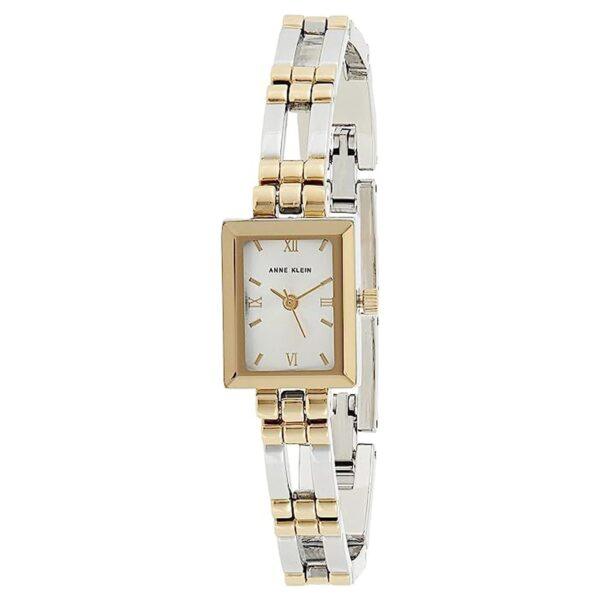 ساعت مچی و دستبند زنانه Anne Klein Women’s Two-Tone Link Bracelet Watch ساعت لباسی با رنگ طلایی و نقرهای با صفحه مستطیل شکل و نشانگرهای اعداد رومی و چوبی و قاب فلزی 16 میلی متری با پنجره مینرال که مقاوم در برابر آب تا عمق 30 متری (99 فوت): به طور کلی در برابر پاشش پاشیده شدن یا غوطه ور شدن کوتاه در آب مقاومت می کند، اما برای شنا مناسب نیست.
