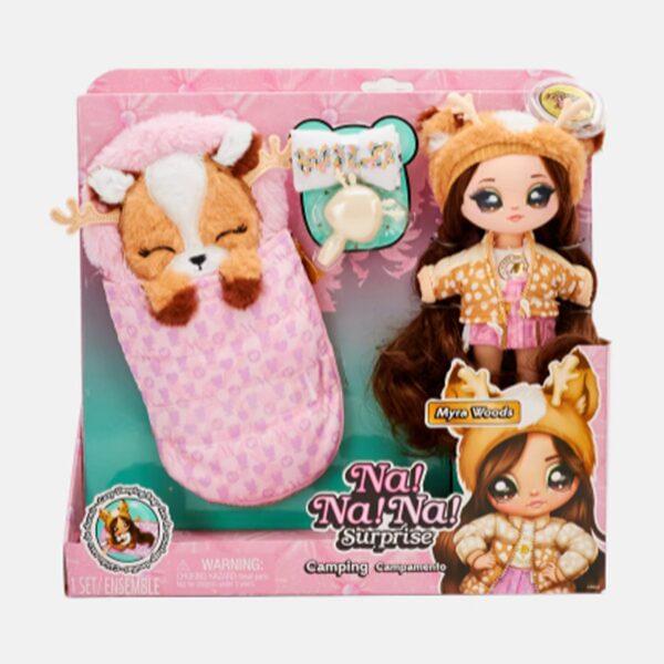 عروسک کمپینگ میرا Na Na Na Surprise Myra Camping Doll, Pink Combo شامل یک عروسک شیک و زیبا، نرم، 7.5 اینچی، کیسه خواب با تم حیوانات، بالش، و برس است.