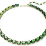 طرح روکش رودیوم بر روی یک زنجیر ظریف با کشیدگی آویزان پوشیده شده است و دارای سه شاخه سنگ زیرکونیای سواروسکی در اشکال مختلف، از جمله سنگ پله مرکزی هشت ضلعی به رنگ سبز است.
