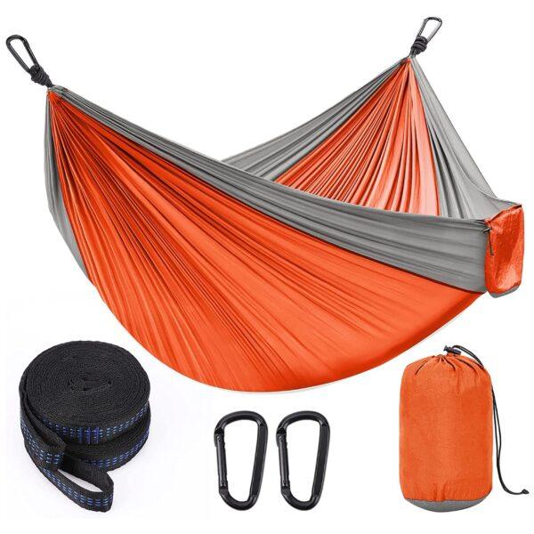ننو کمپینگ (تخت آویز) Camping Hammock Double & Single دوبل دقیقا با مواد نایلون چتر نجات 210T با کیفیت عالی طراحی شده است که نرم، قابل تنفس، خشک شدن سریع، سبک وزن و بادوام است. با دوخت سه گانه به هم پیوسته که باعث می شود احساس راحتی در تاب خوردن یا خوابیدن روی درخت داشته باشید.ننو کمپینگ دوبل حداکثر تا وزن 500 پوند و اندازه تا شده 270×140 سانتی متر است.ننو دو نفره می تواند 2 بزرگسال یا 4 کودک عادی را به راحتی تحمل کند. فقط برای استفاده راحت باشید، نگران زمین خوردن نباشید. بسیار بزرگ برای دراز کشیدن با دوستان یا خانواده خود، اما همچنان فضای زیادی بدون شلوغی خواهید داشت.یت آویزان تسمه تاب درختی برای انواع تاب و بانوج مناسب است. کمتر از 3 دقیقه طول می کشد تا ننو کمپینگ خود را بدون هیچ ابزاری روی درخت آویزان کنید. هر تسمه 10 فوتی 15 حلقه دارد و تا 2200 Ibs را نگه می دارد، اما به درخت آسیب نمی رساند. بند قابل تنظیم می تواند آنها را دور هر درختی با اندازه متفاوت، بدون توجه به شاخه ضخیم یا نازک، بپیچد.ندازه تاشو بانوج سبک وزن قابل حمل 5 x 5 x 7.4 اینچ است، وزن آن تنها 0.7 کیلوگرم است. بسته شامل یک ننو، یک کیف حمل، 2 بند درختی قابل تنظیم و 2 کارابین شکل D است. تمامی لوازم جانبی سبک و قابل حمل هستند. فقط ننو مسافرتی را برای سفر، کمپینگ و سفر کوله‌پشتی خود در کیف کوچک وصل کرده‌اید.