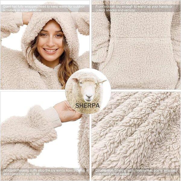 هودی پتویی Ililmmoe جادار و گرم، چیزی که برای لذت بردن از ساعات شادی ضروری است. برای استراحت در خانه، تماشای تلویزیون، بازی، چرت زدن، همچنین برای فعالیت های خارج از منزل، قهوه صبح در بیرون، در یک رویداد ورزشی، کمپینگ یا پیک نیک در هوای مرطوب عالی است.هودی پتویی Ililmmoe ساخته شده از شرپا دو طرفه پشم گوسفند بسیار نرم. وقتی می پوشید احساس می کنید در ابر پیچیده شده اید.با هودی پتویی Ililmmoe خود را برای زمستان آماده نگه دارید.پتوهای پوشیدنی با آستین های بلند دستان شما را آزاد می کند.با هودی پتویی Ililmmoe می توانید یک لیوان شکلات داغ را در حین تماشای سریال های تلویزیونی روی مبل بچشید یا در حین پیک نیک غذا تهیه کنید.