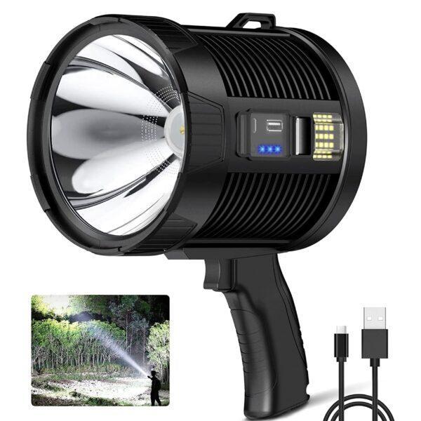 چراغ قوه دستی قدرتمند Rechargeable Spotlight Flashlight با جدیدترین فیتیله بارگذاری شده است و 100000 لومن خروجی می دهد. می تواند فورا قله کوه را از پای کوه روشن کند.